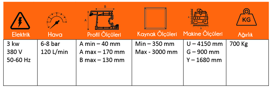 - PVC profillerin 50-180 derece açılarda her iki kafada aynı anda kaynak yapabilme imkanı